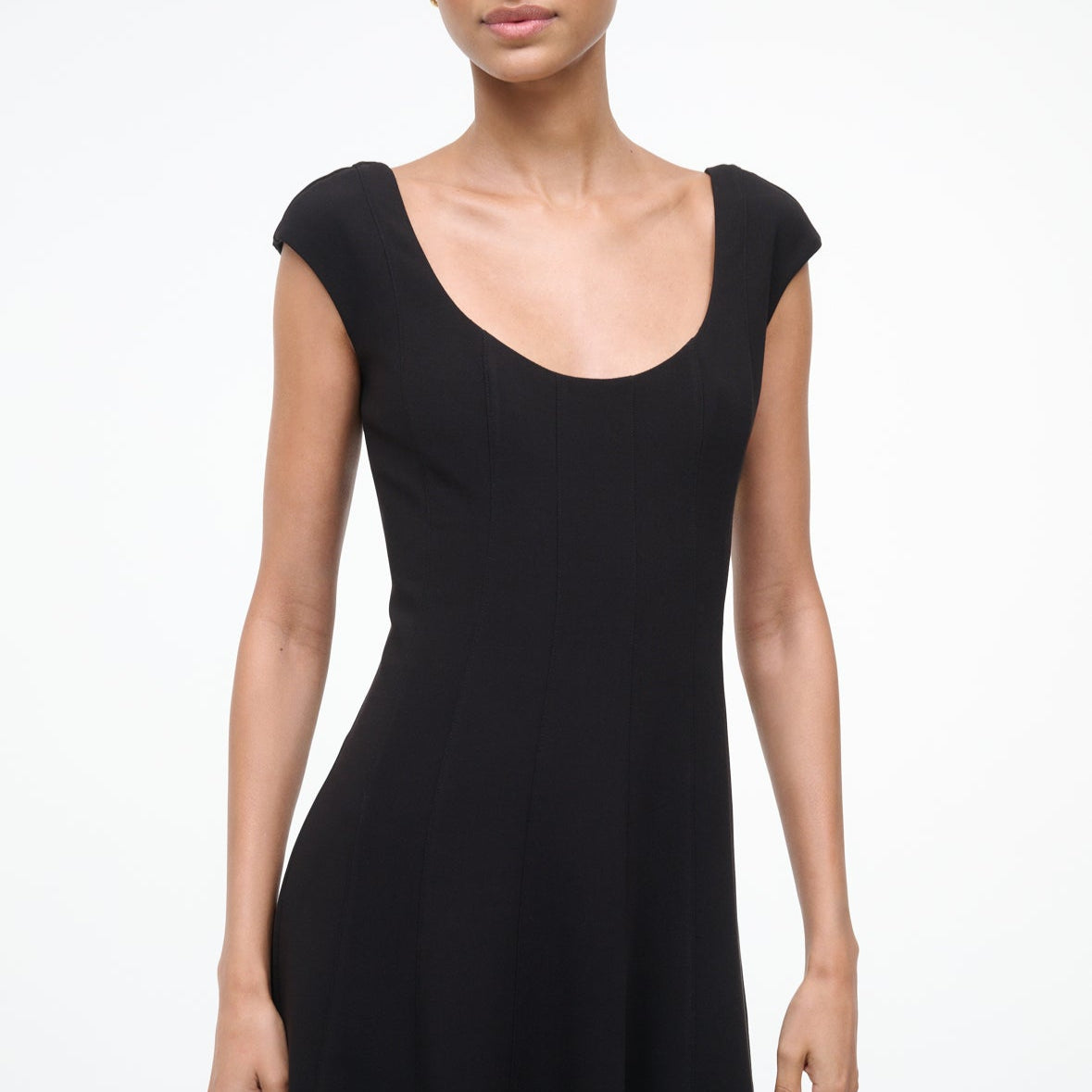 Cap-sleeve princess-seamed midi dress. Fully lined.