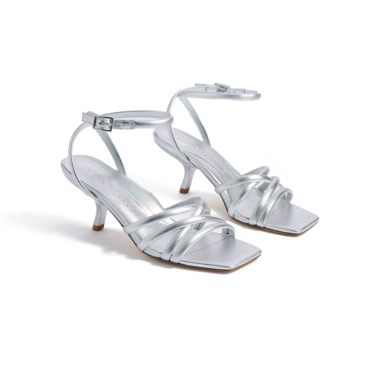 Metallic nappa leather sandal with an angled kitten heel and puffed nappa leather straps