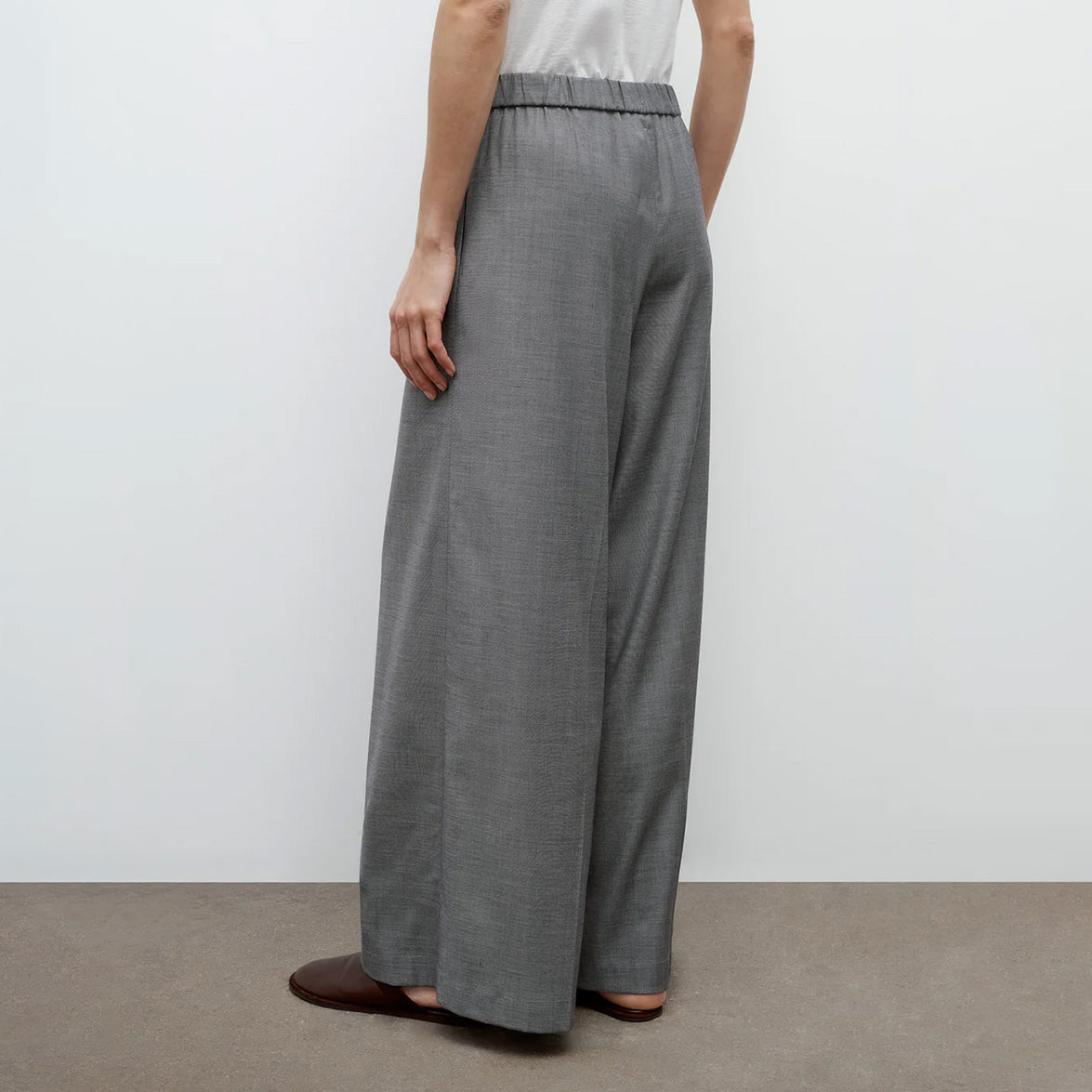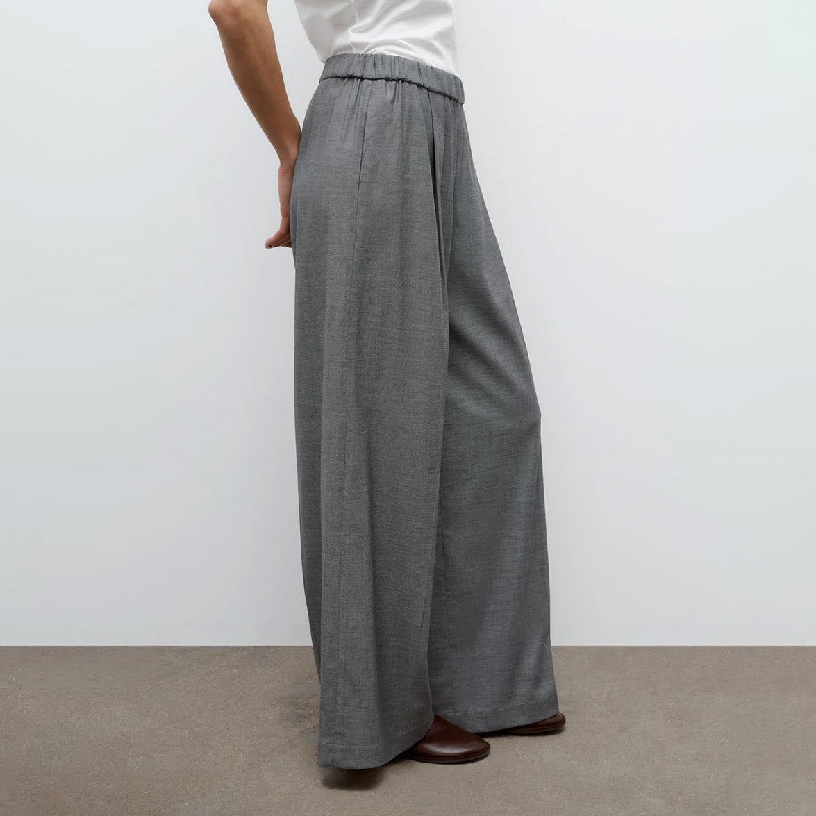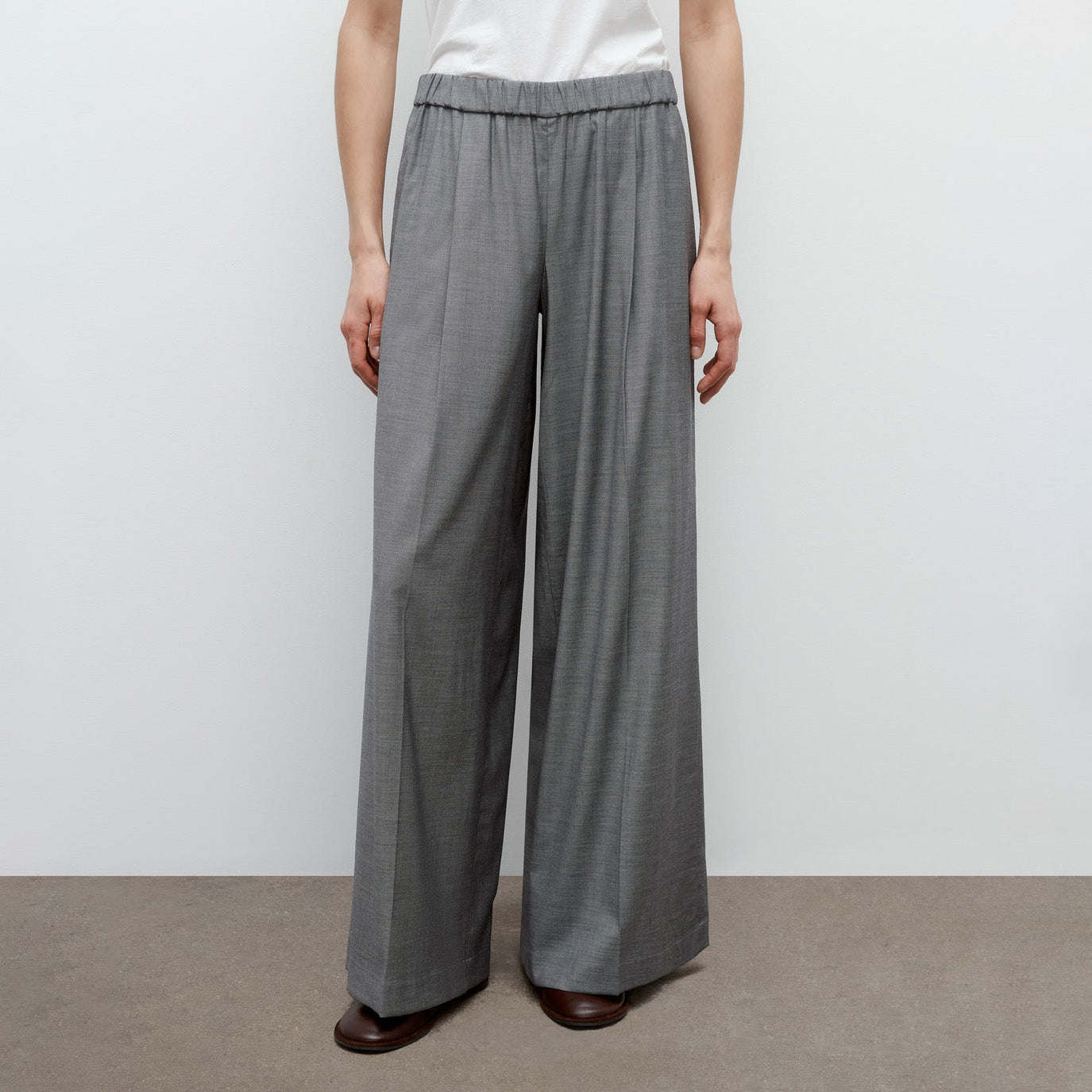 Mid-rise, wide leg pant. Elastic waistband. Pleats at center front. Inseam pockets.