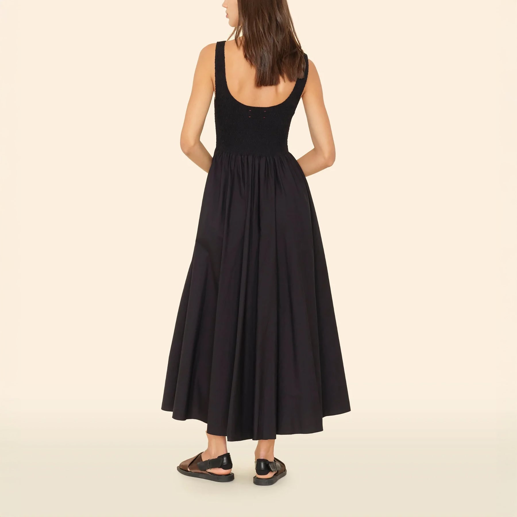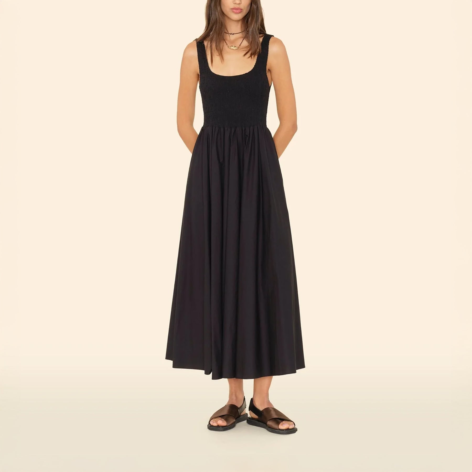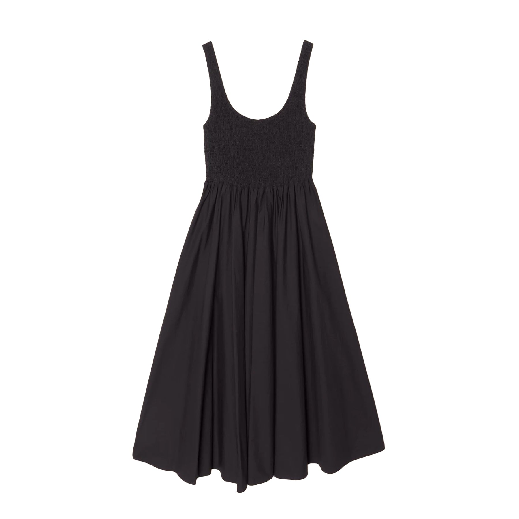 Sleeveless midi-length sundress. Square neckline, smocked bodice, and side seam pockets.