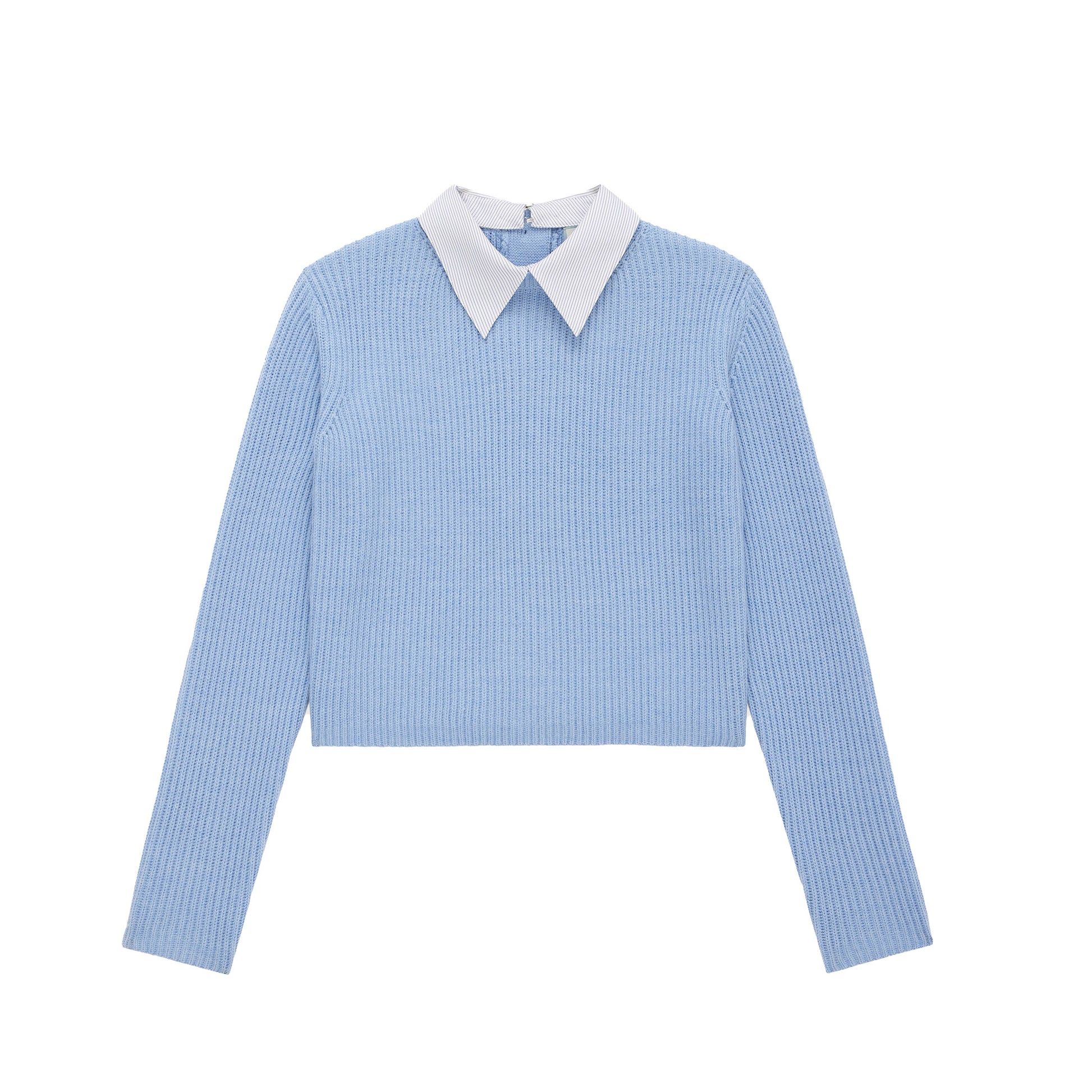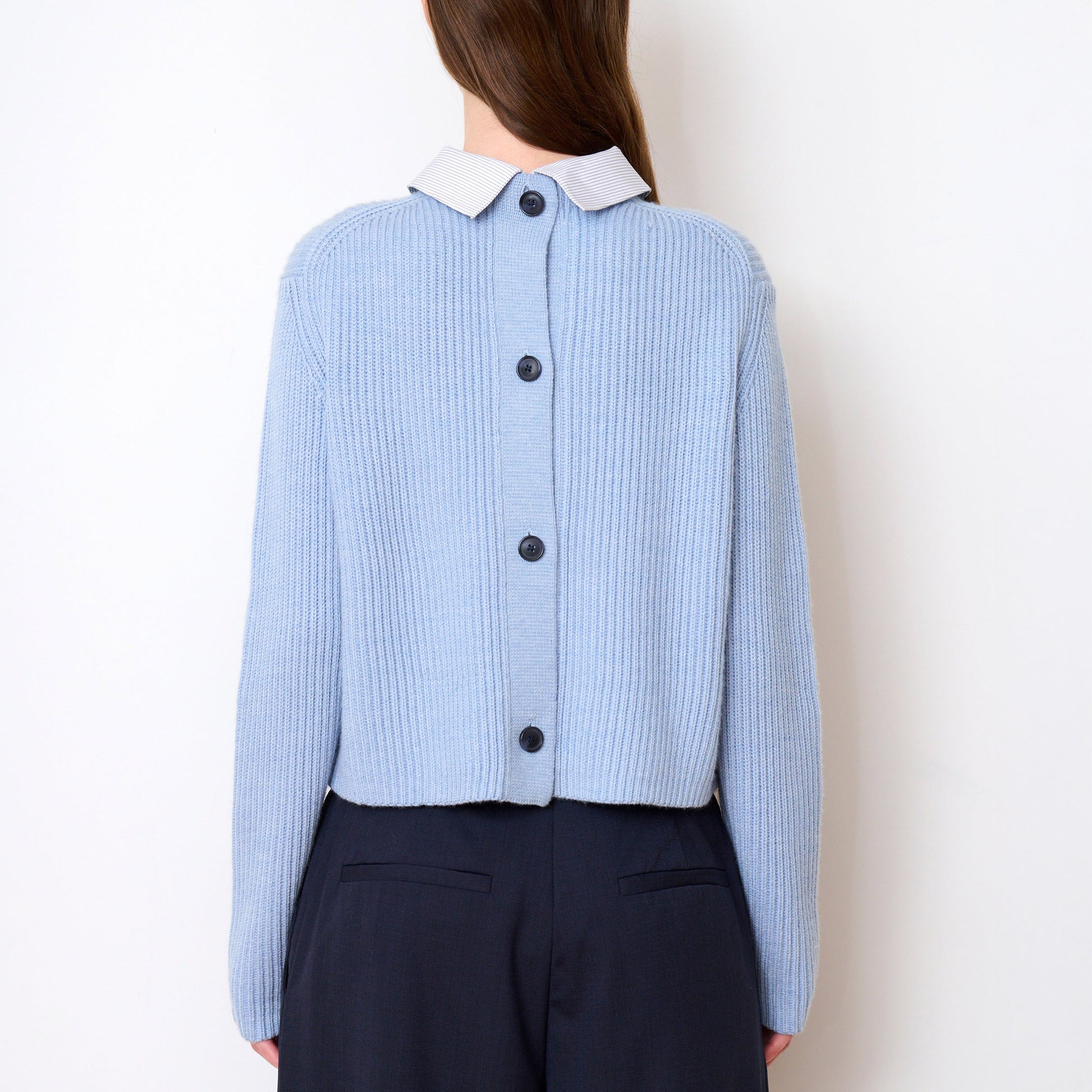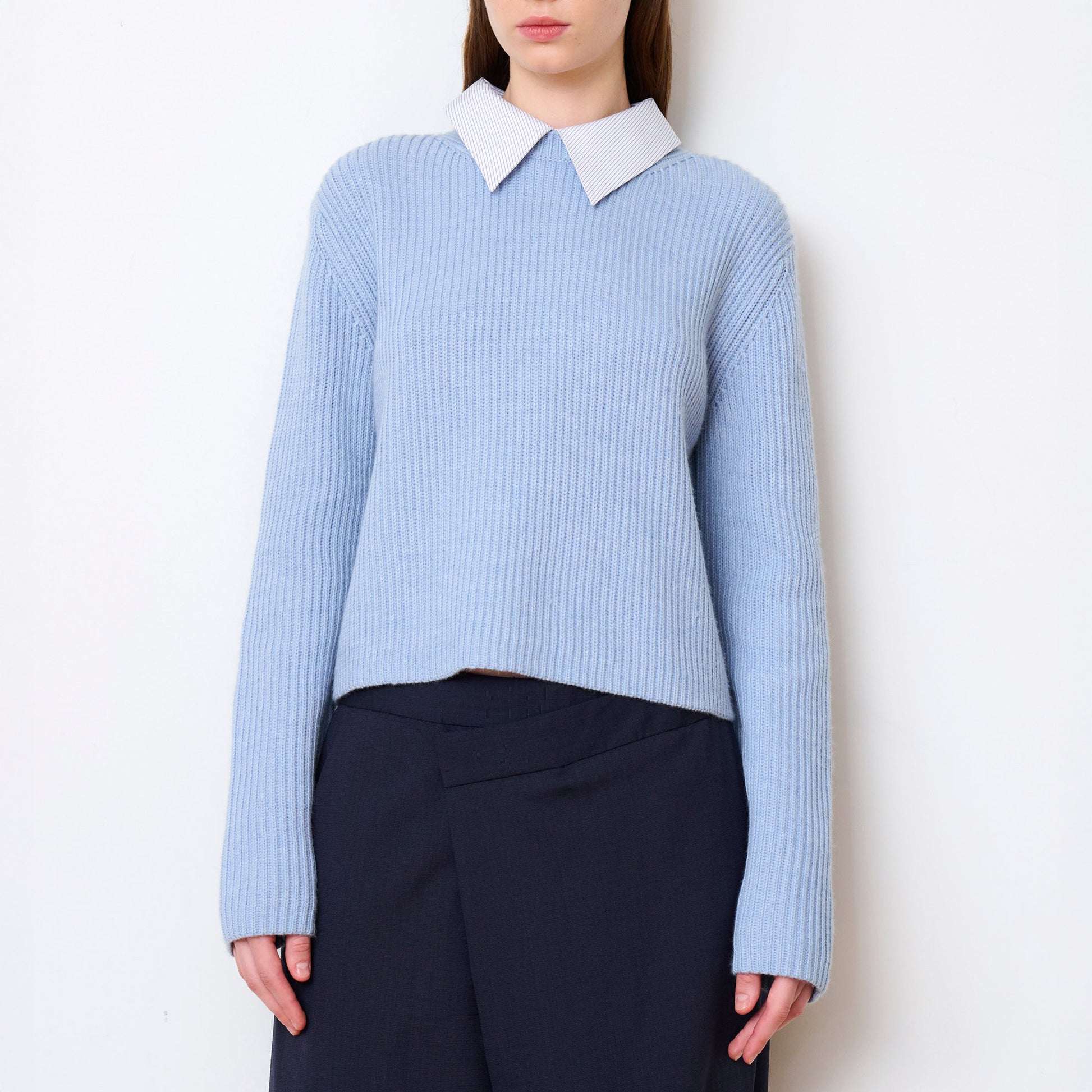 Chunky crewneck sweater spliced with shirting details. Detachable poplin collar and exposed button-back closure.