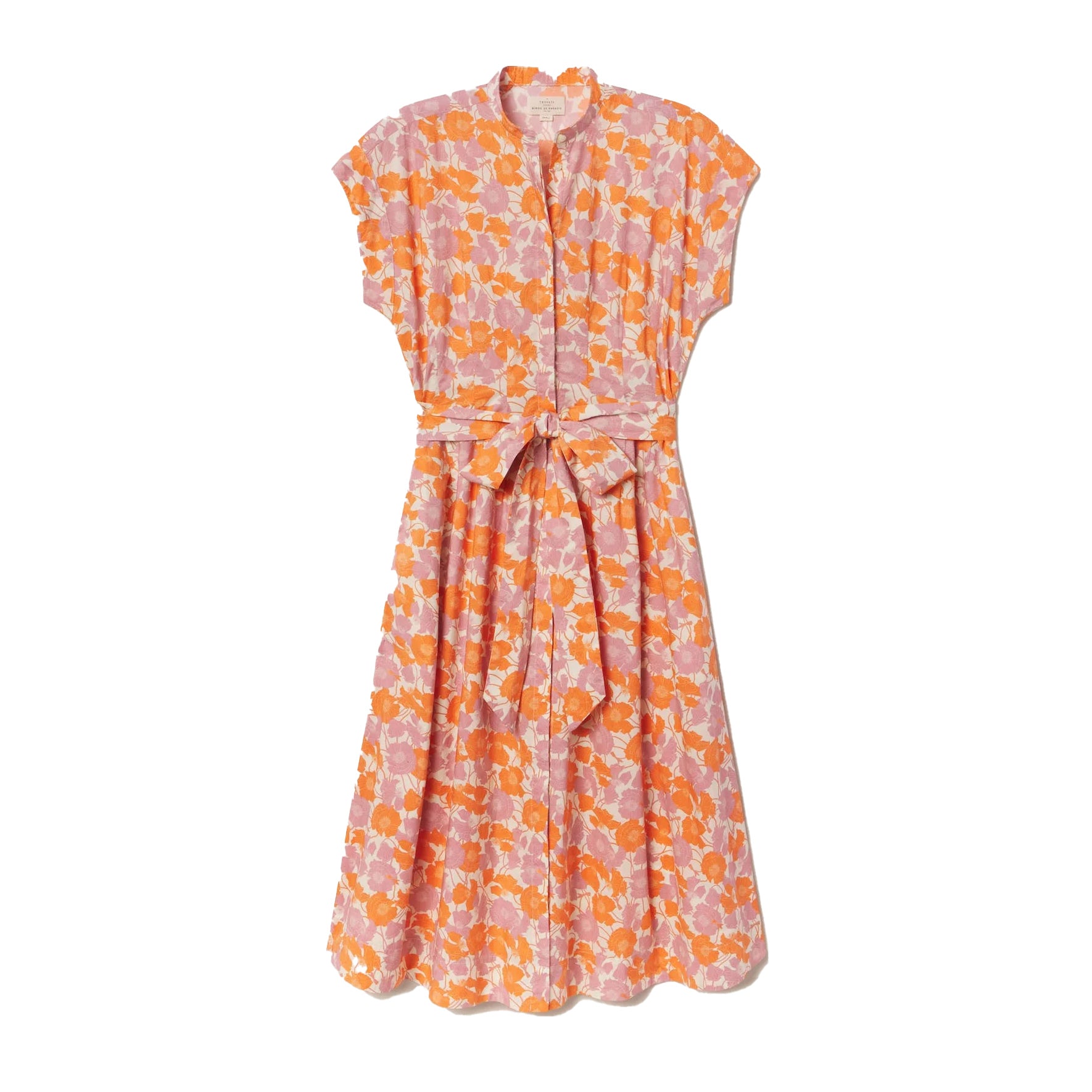 Midi length shirtdress. Front and back waist darting and sash. Side seam pockets and front button placket.