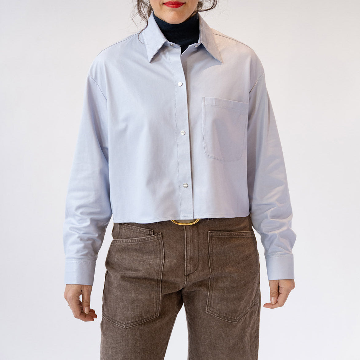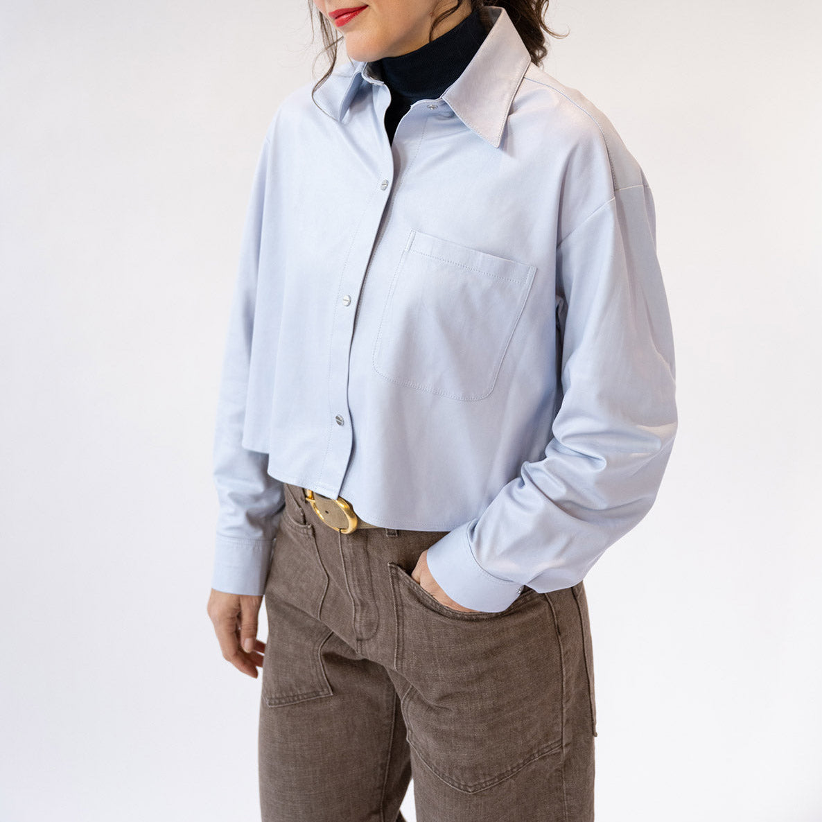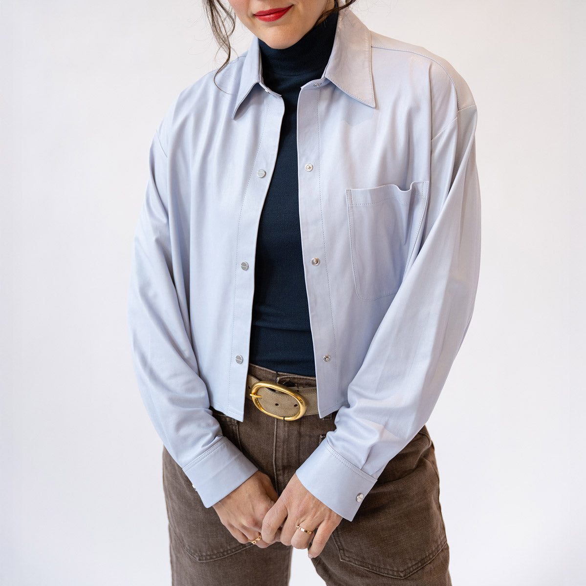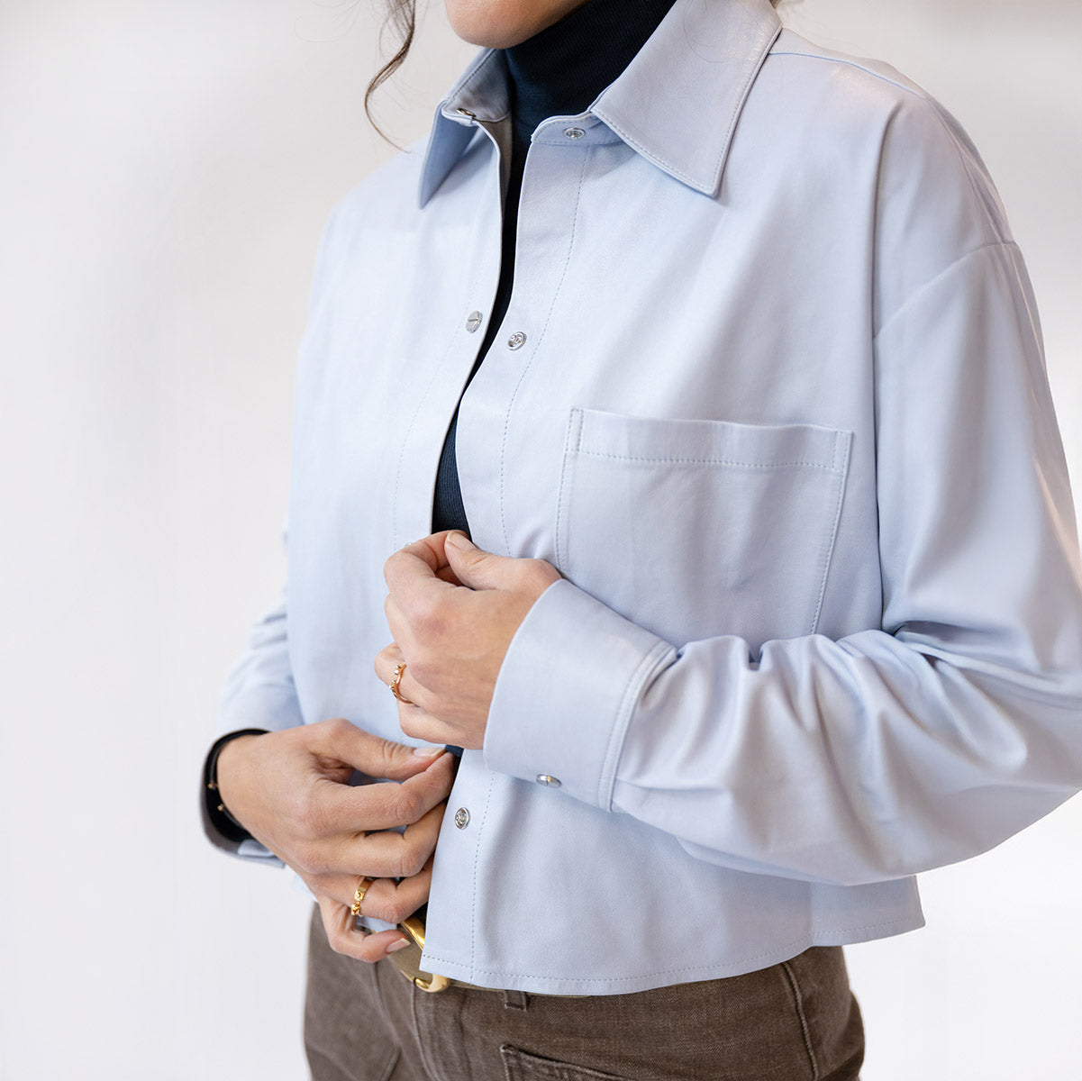 Cropped long sleeved leather shirt with box pleat at center back and a button up placket