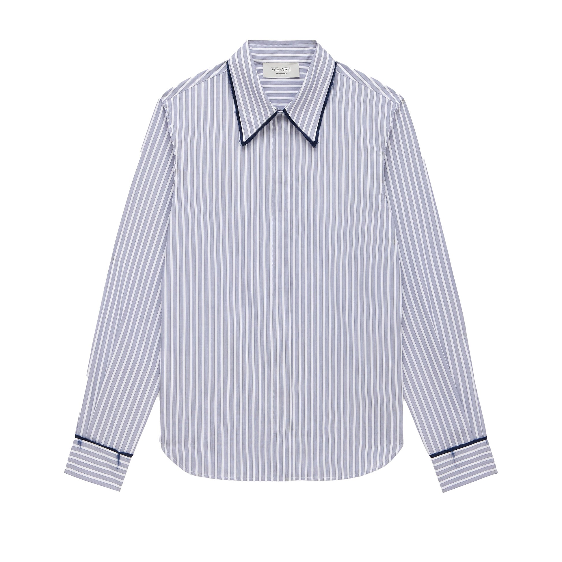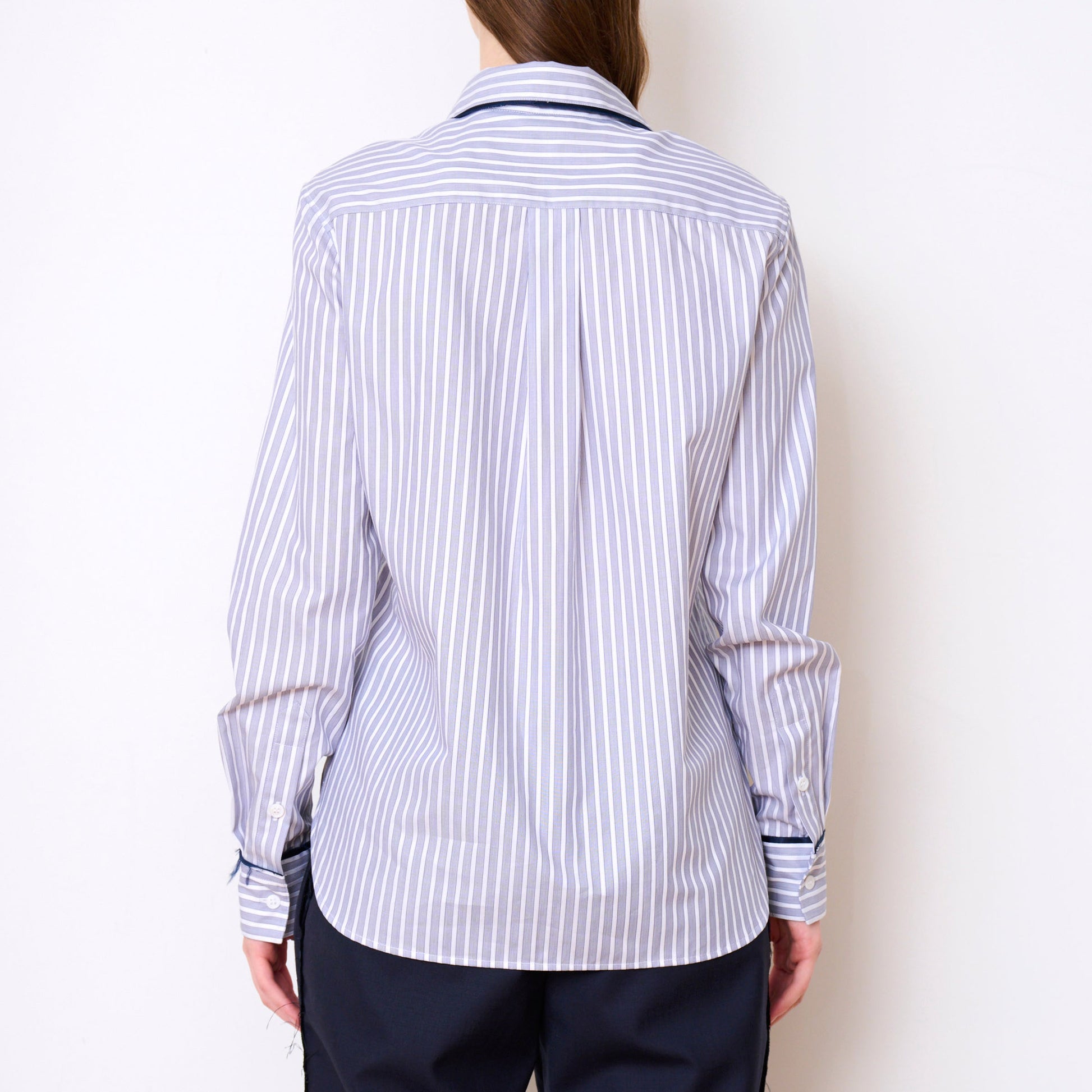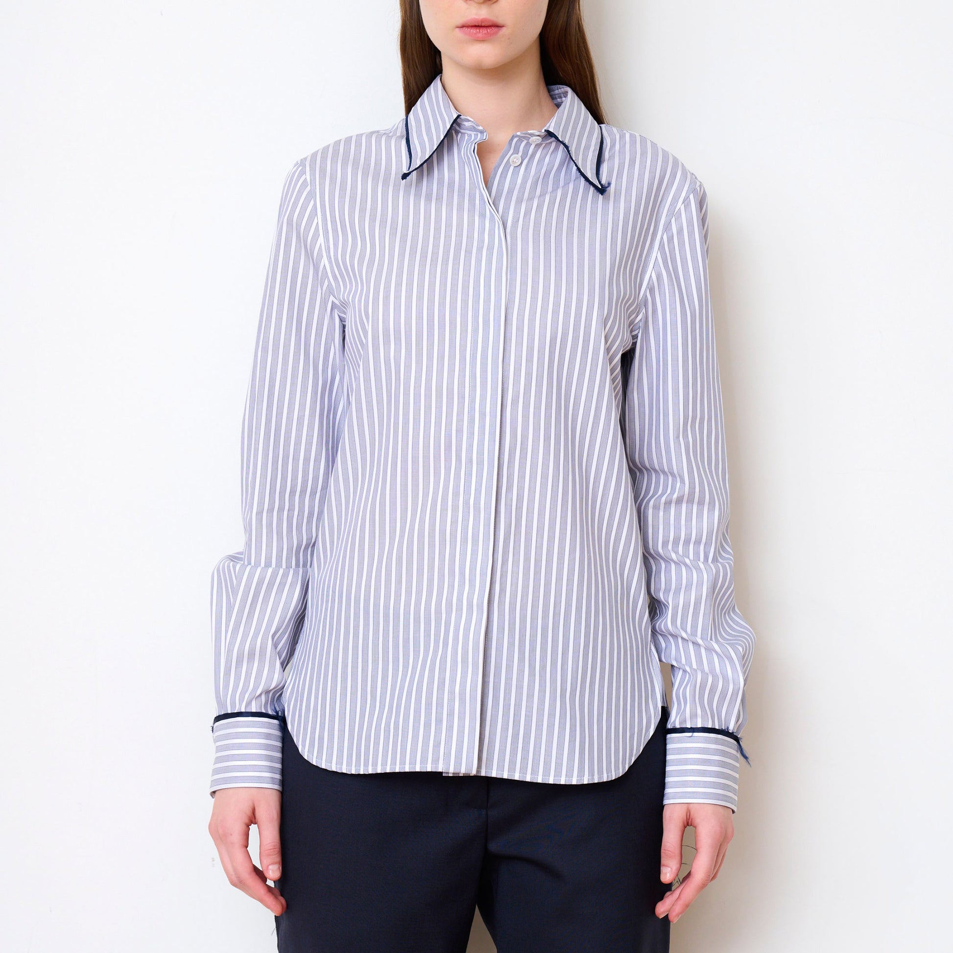 A classic button up in cotton poplin gets reimagined with raw-edge satin trim.