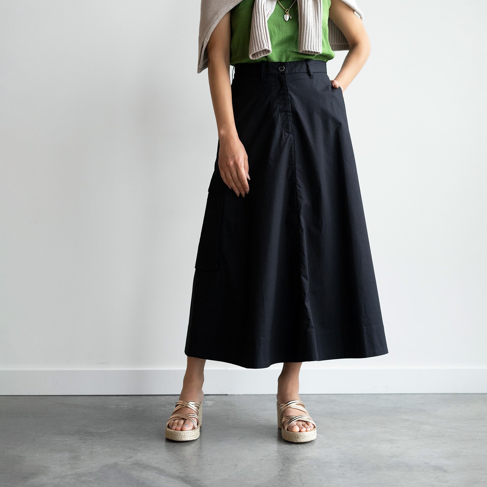 Midi length skirt with trouser details and cargo pocket. A-line shape. Belt loops.