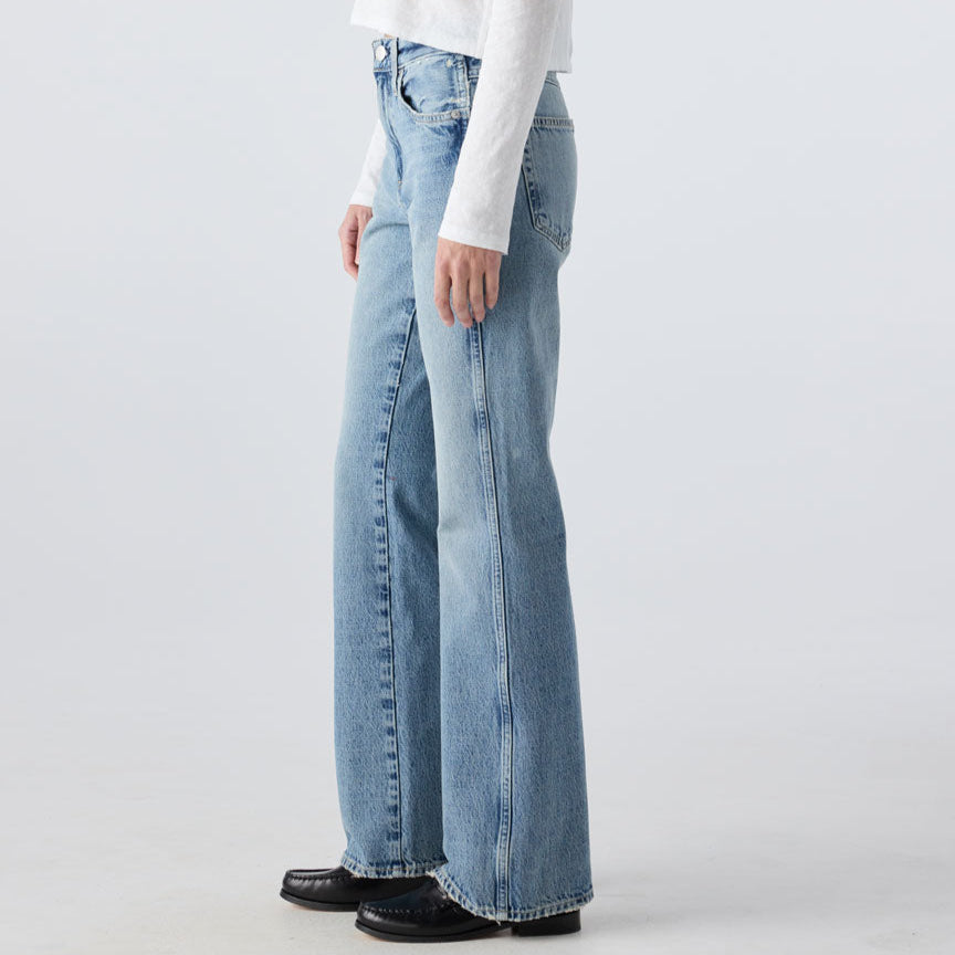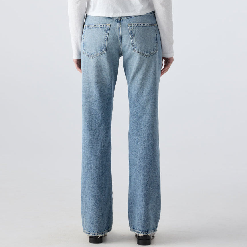 Slouchy, with a relaxed rise and full length leg. Intended to sit on the hips.