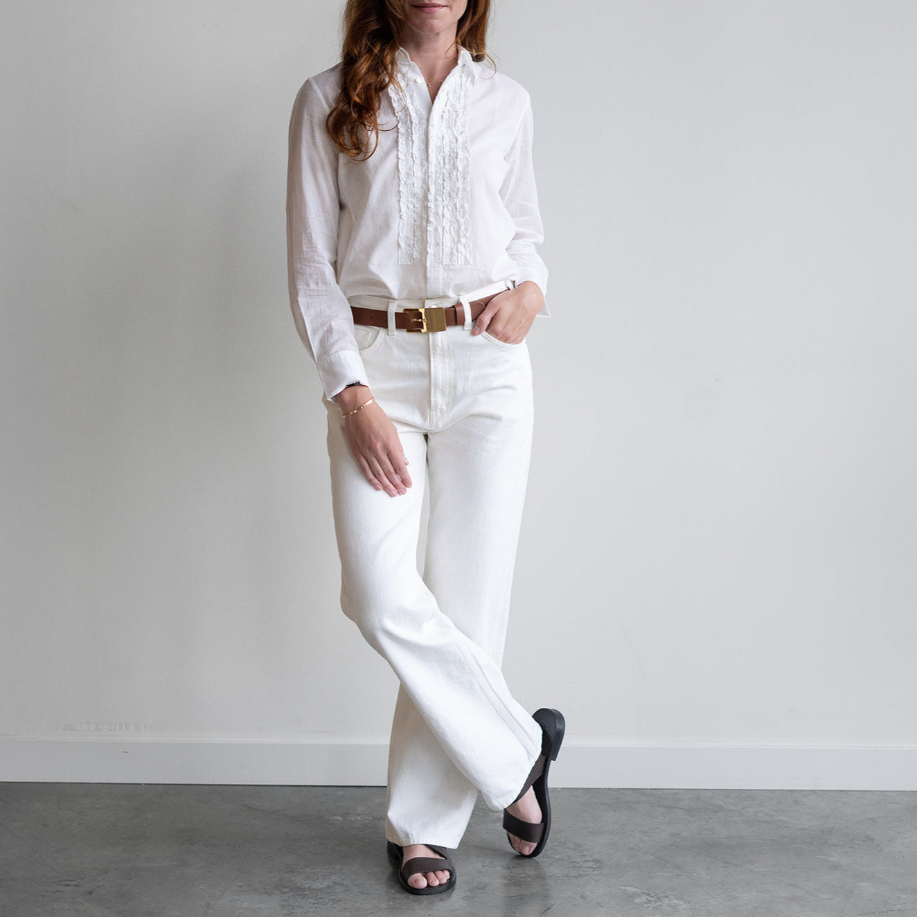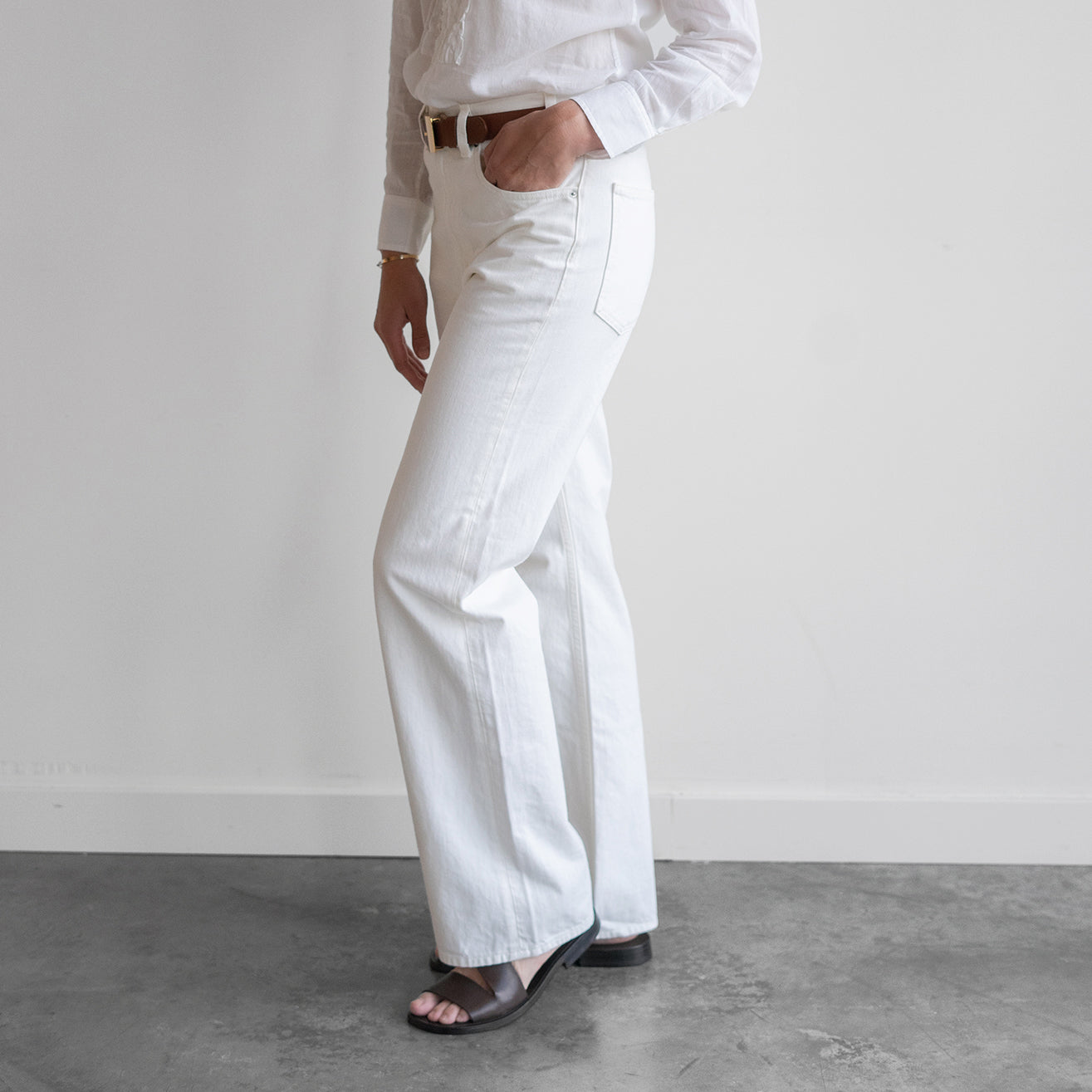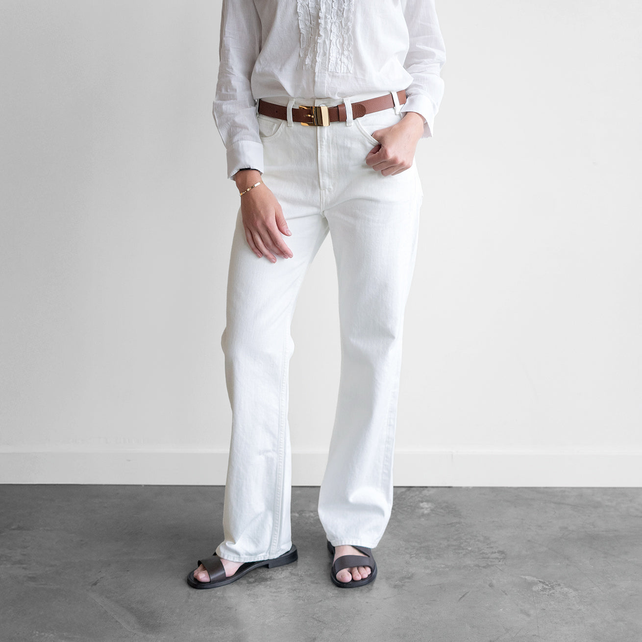 Mid-rise relaxed leg jean in non-stretch denim. Five pocket details, zip fly and belt loops.