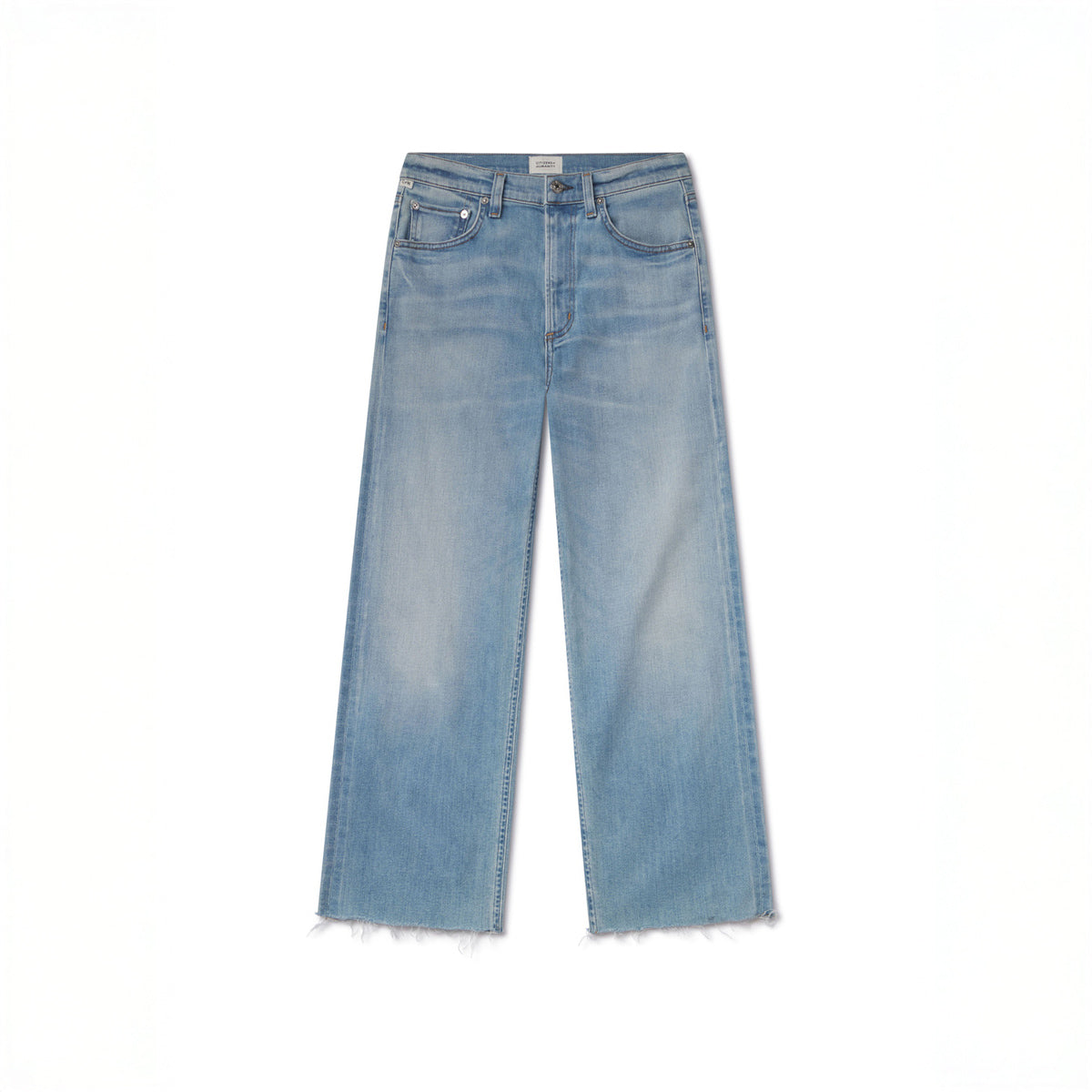 High-rise straight leg silhouette. Cropped length with an unfinished hem.