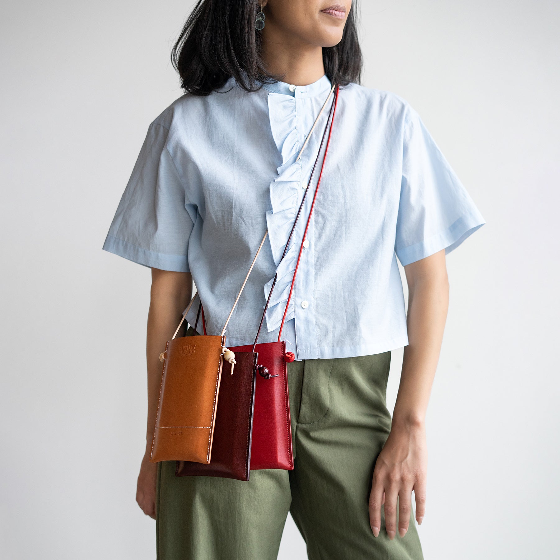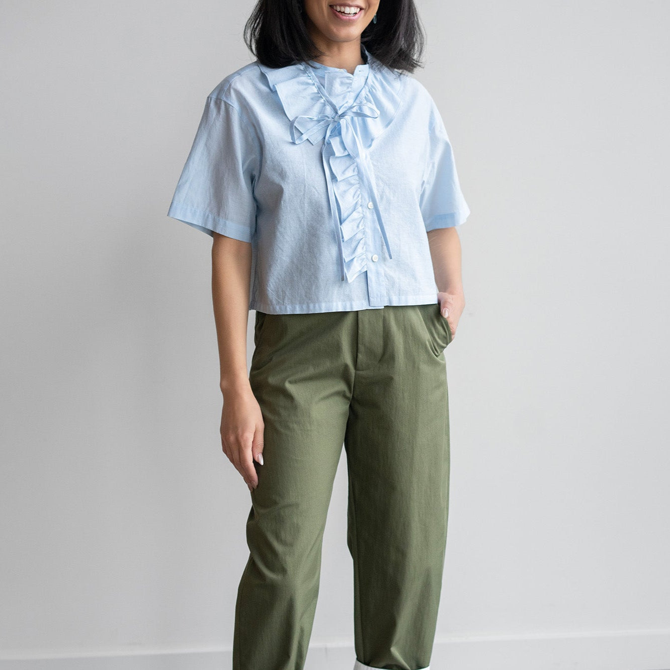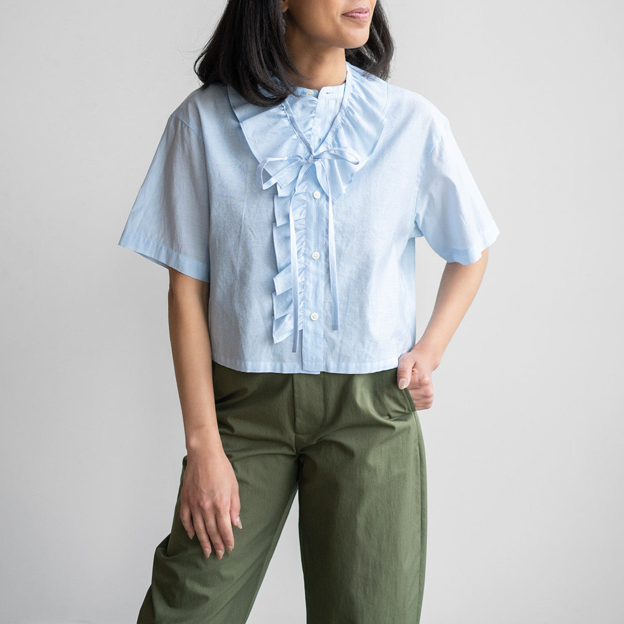 Buttons all the way up, half sleeves and a removable ruffle collar
