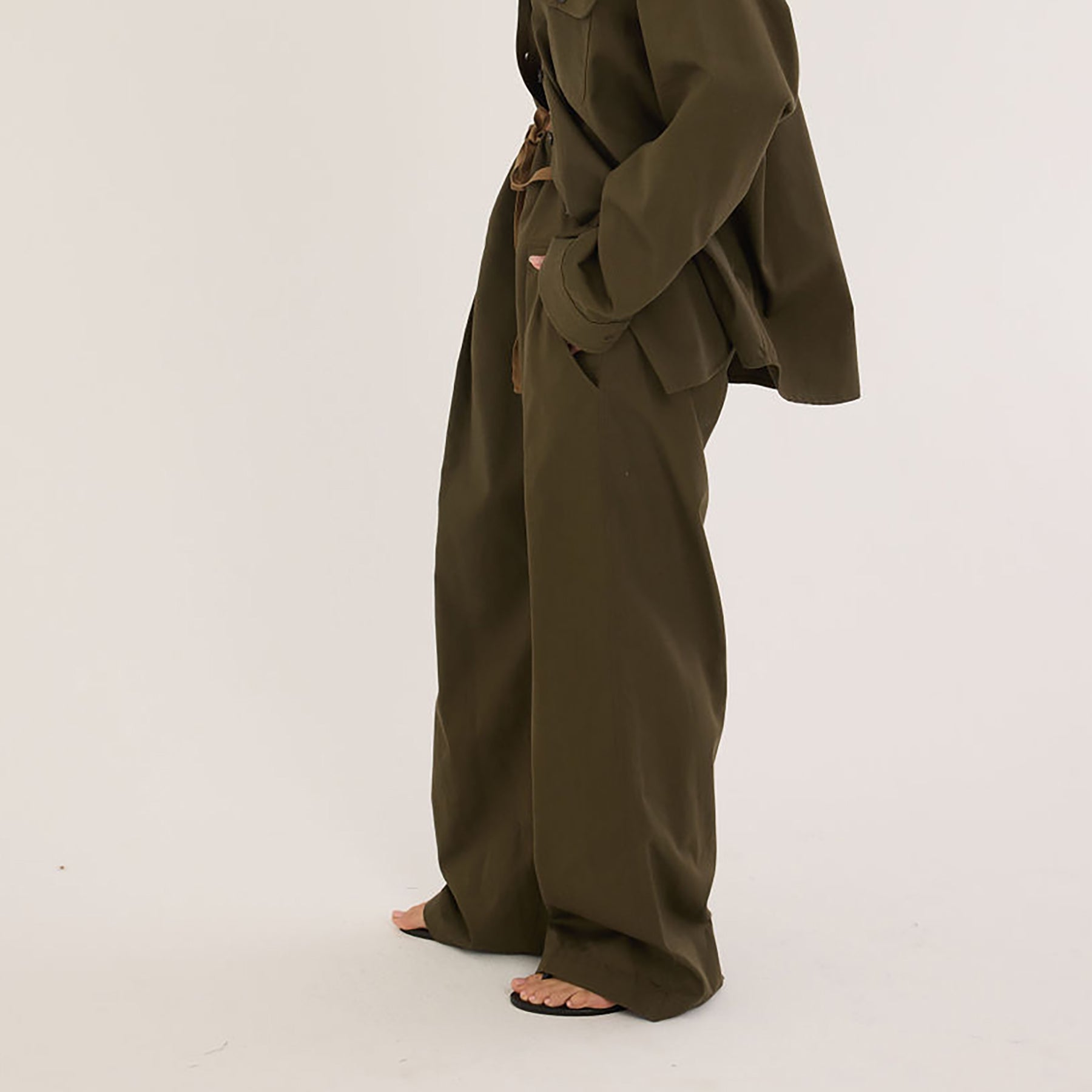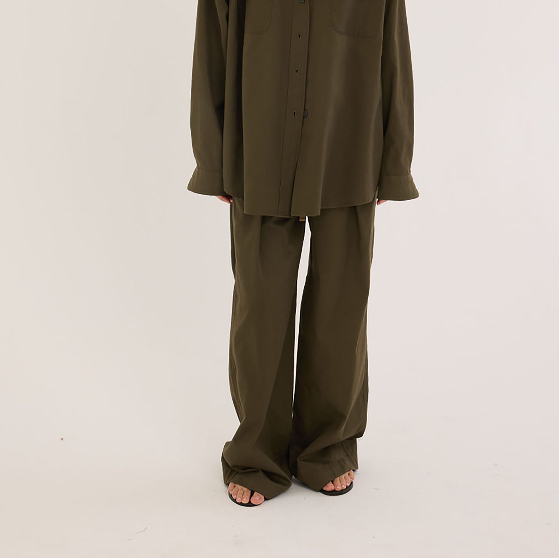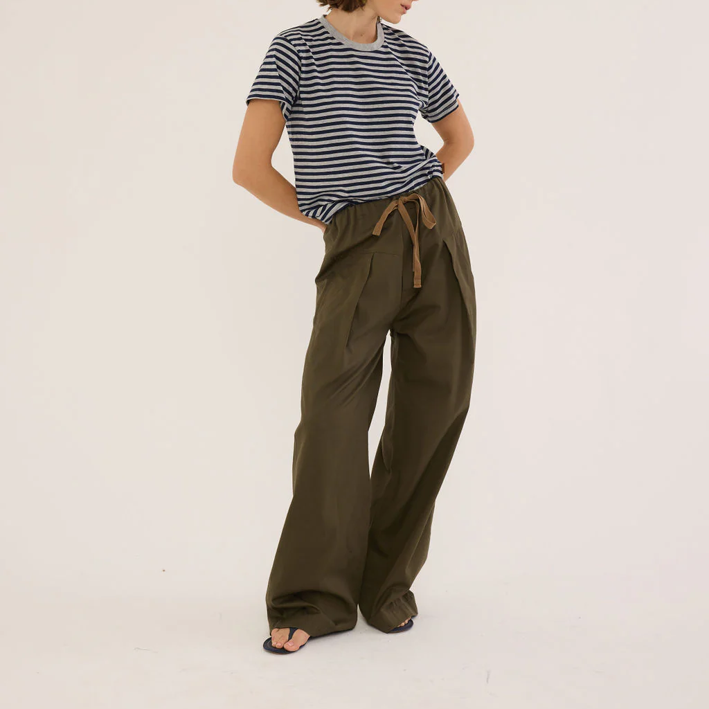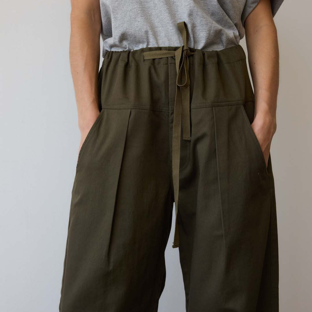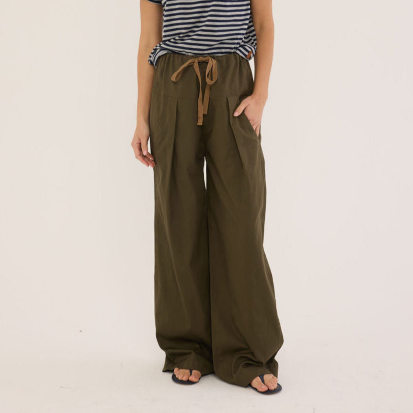 Loose leg drawstring pant with board short-inspired yoke. Pleats below hips.
