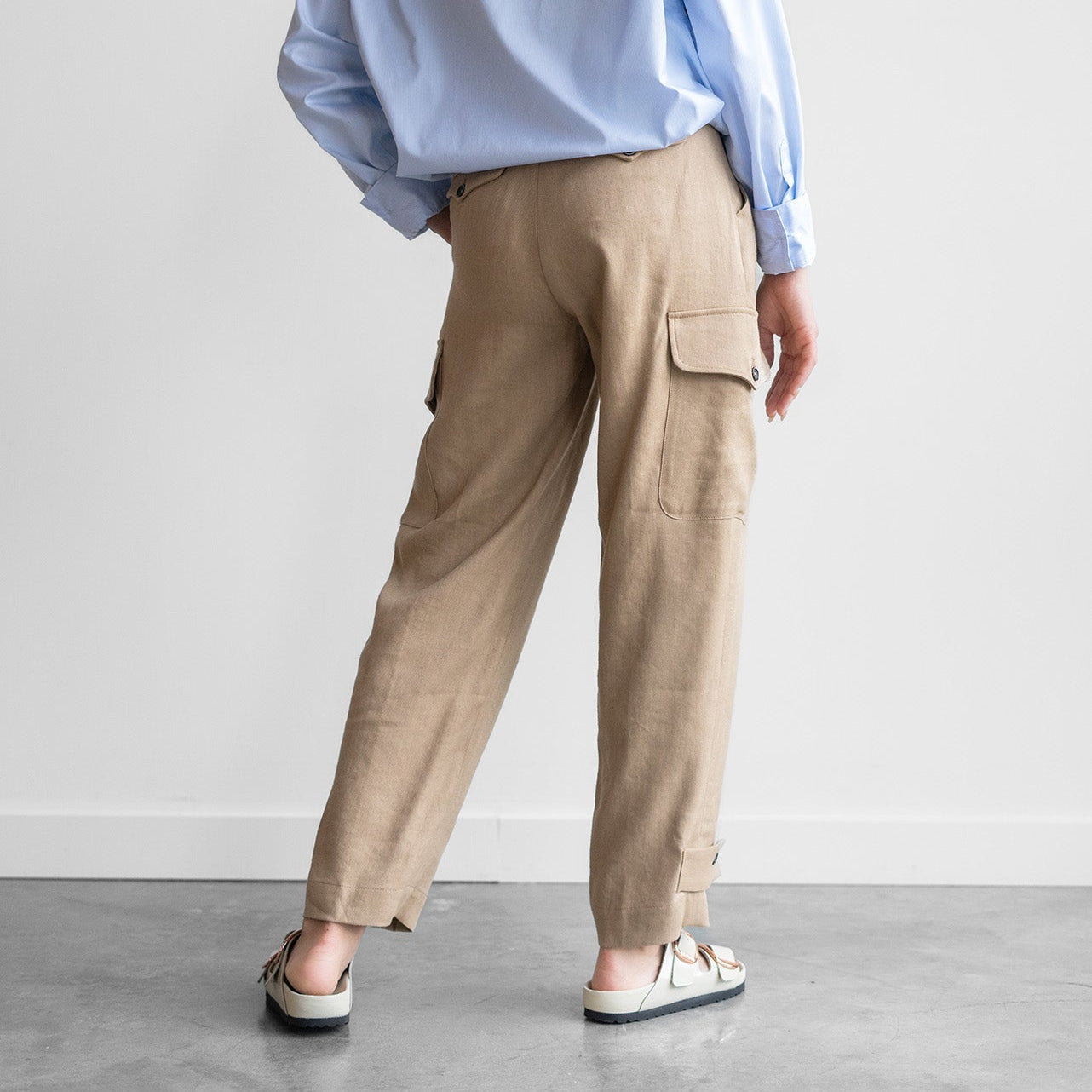 Drapey chino with tapered shape and cargo pockets. Front pleats and slash pockets with notched waist.