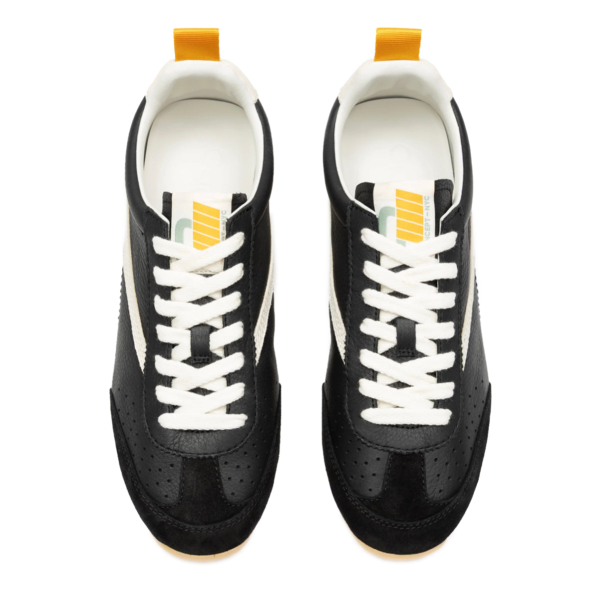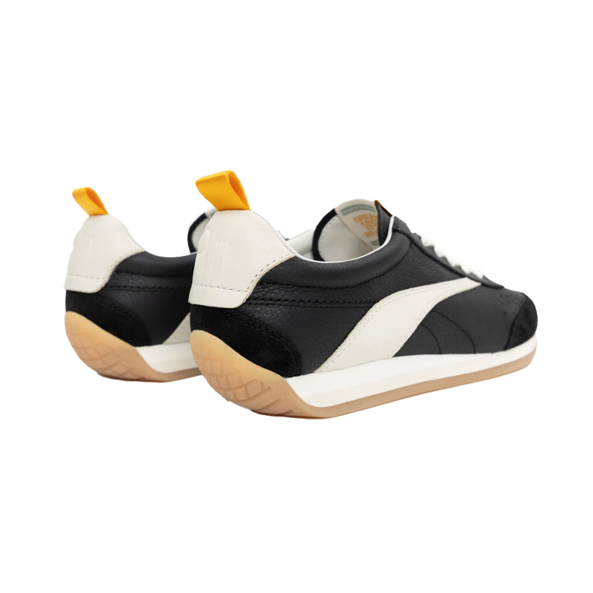 Recycled leather and suede sneaker with white mid-sole and gum sole.