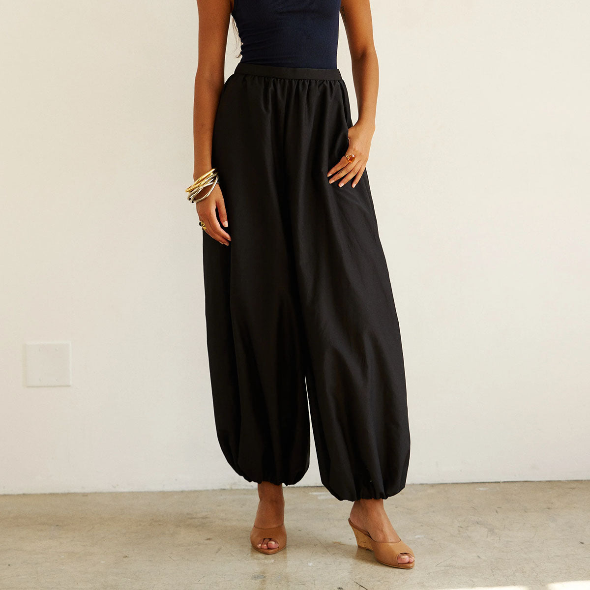 Elastic waist, pull on pant with extreme volume. Clean front, elastic back construction.
