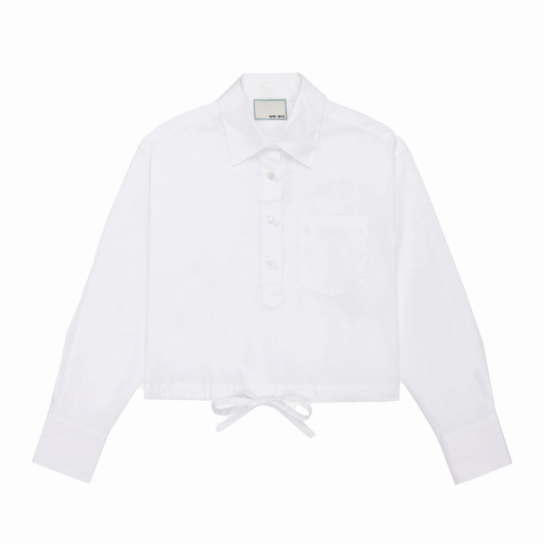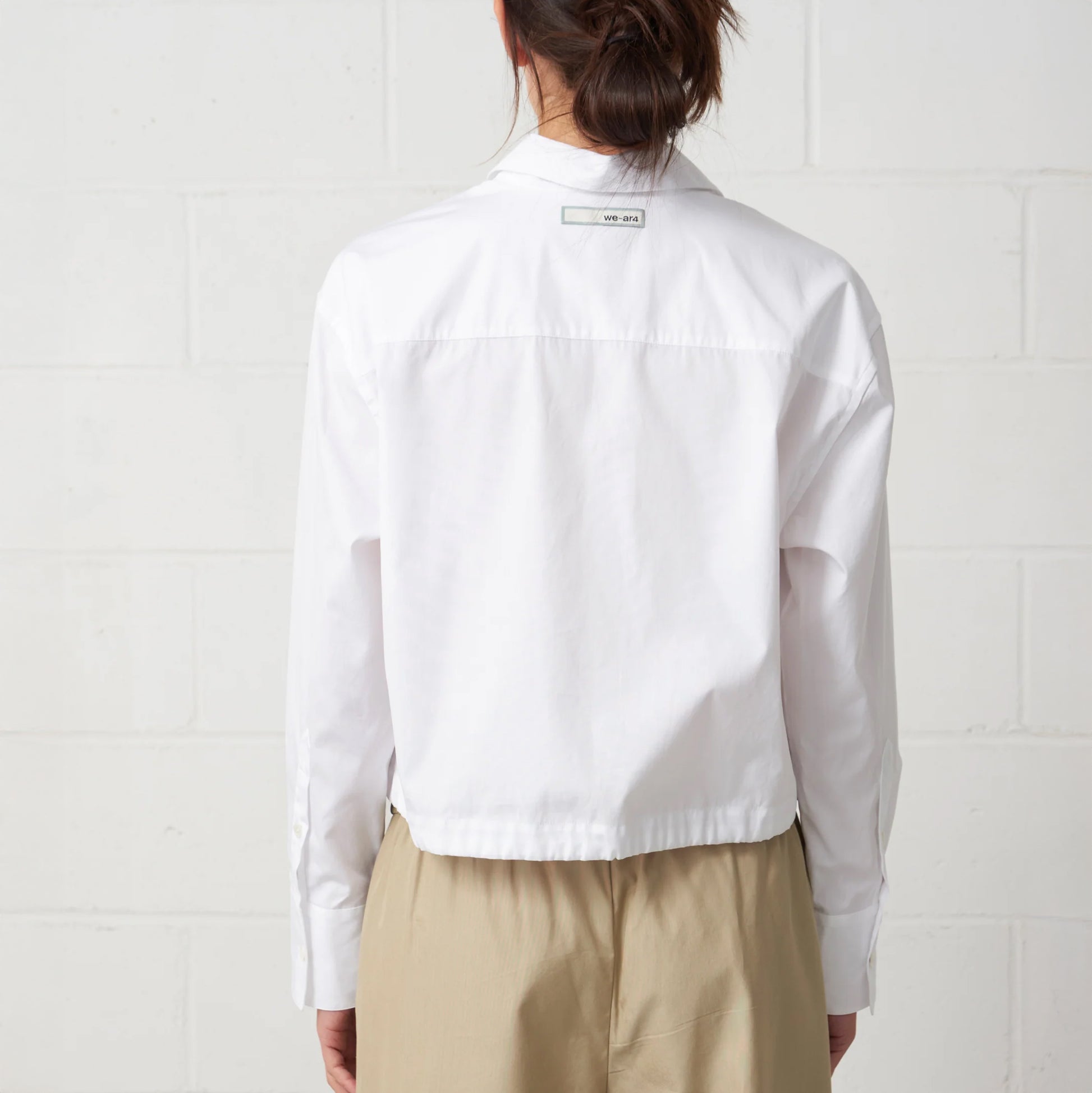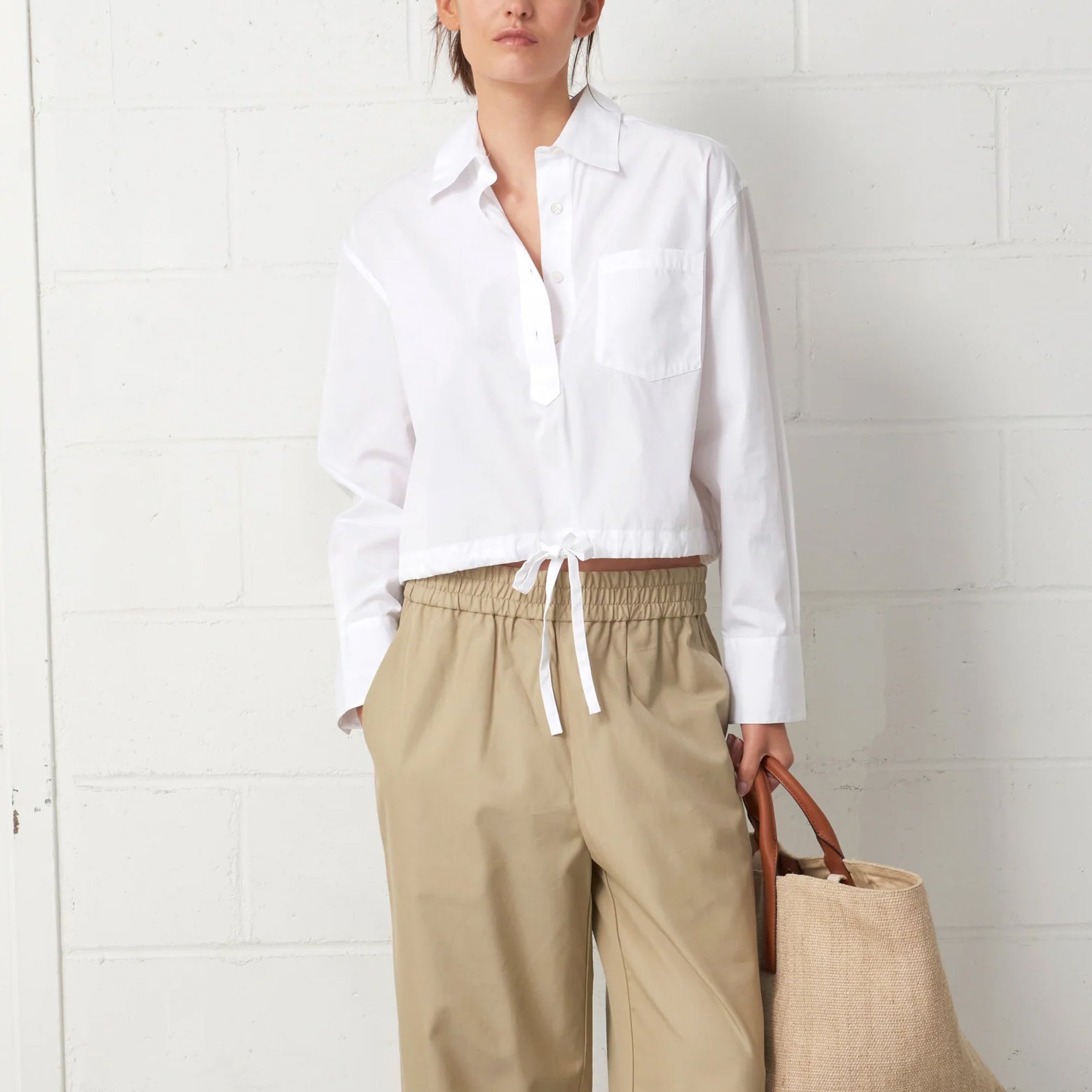 Classic, crisp tailored shirt with a twist. Cropped silhouette with a drawstring waist.