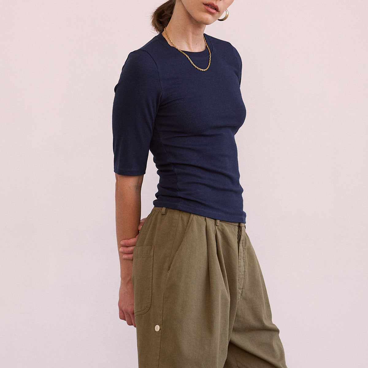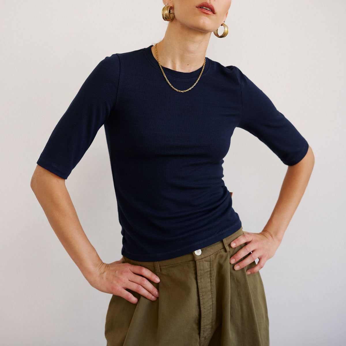 Slim fit ribbed tee with elbow length sleeves and crew neckline.