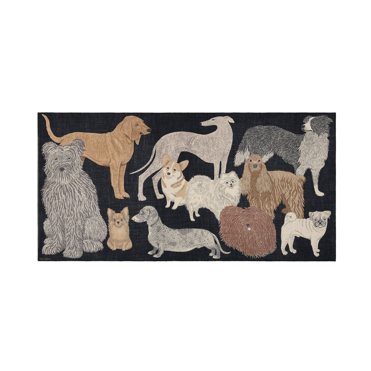 Rectangular scarf with handprinted dog motif.