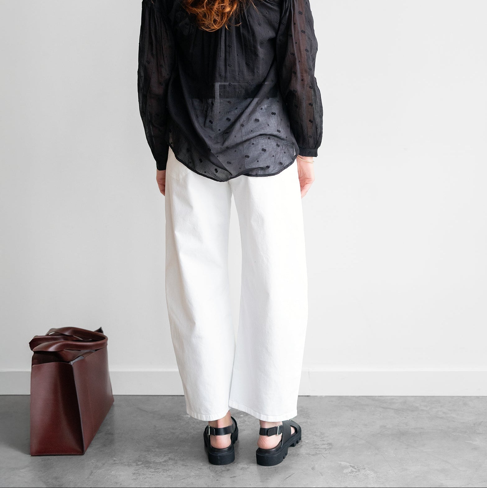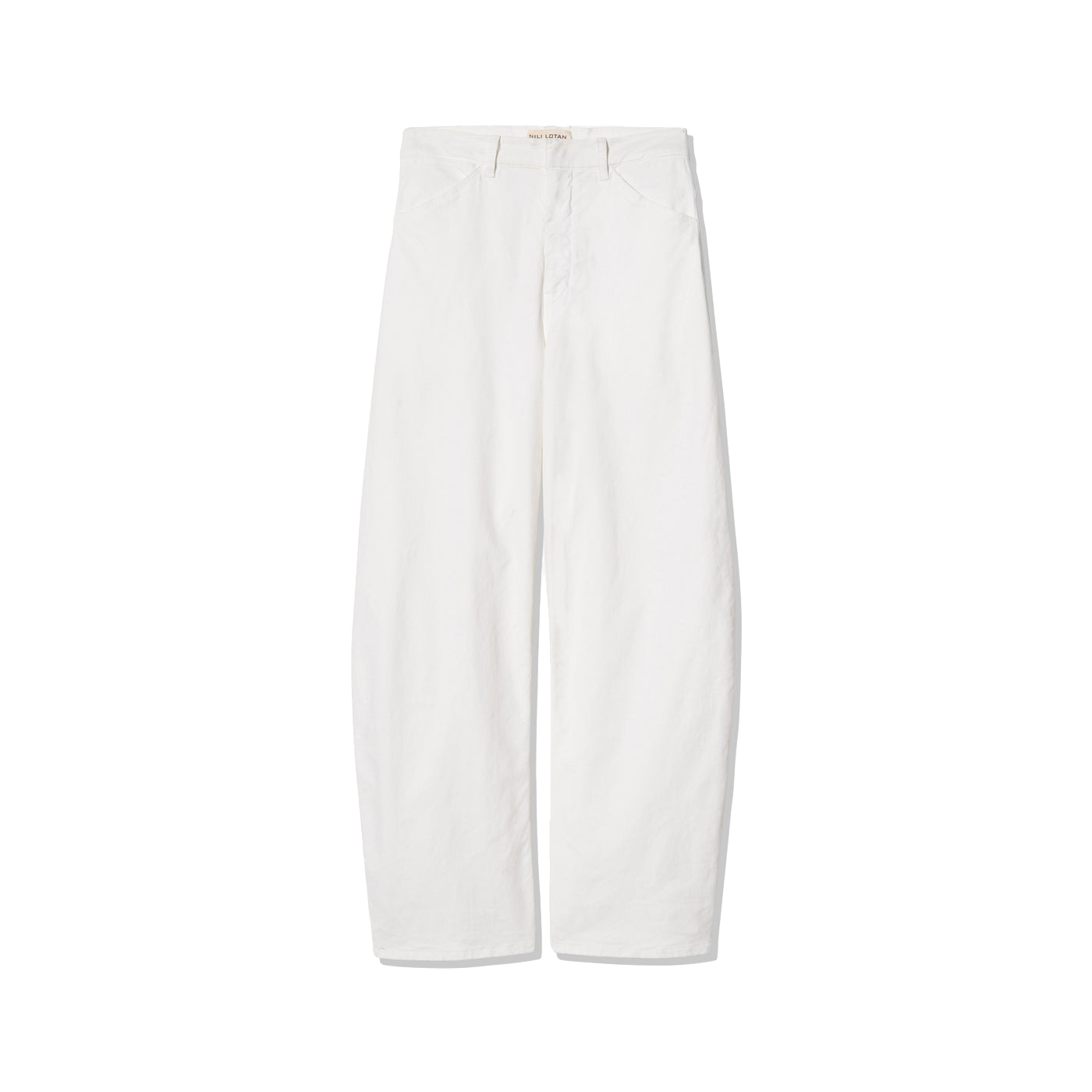 Relaxed barrel leg pant. Mid-rise with zip fly and hidden hook and bar closure.