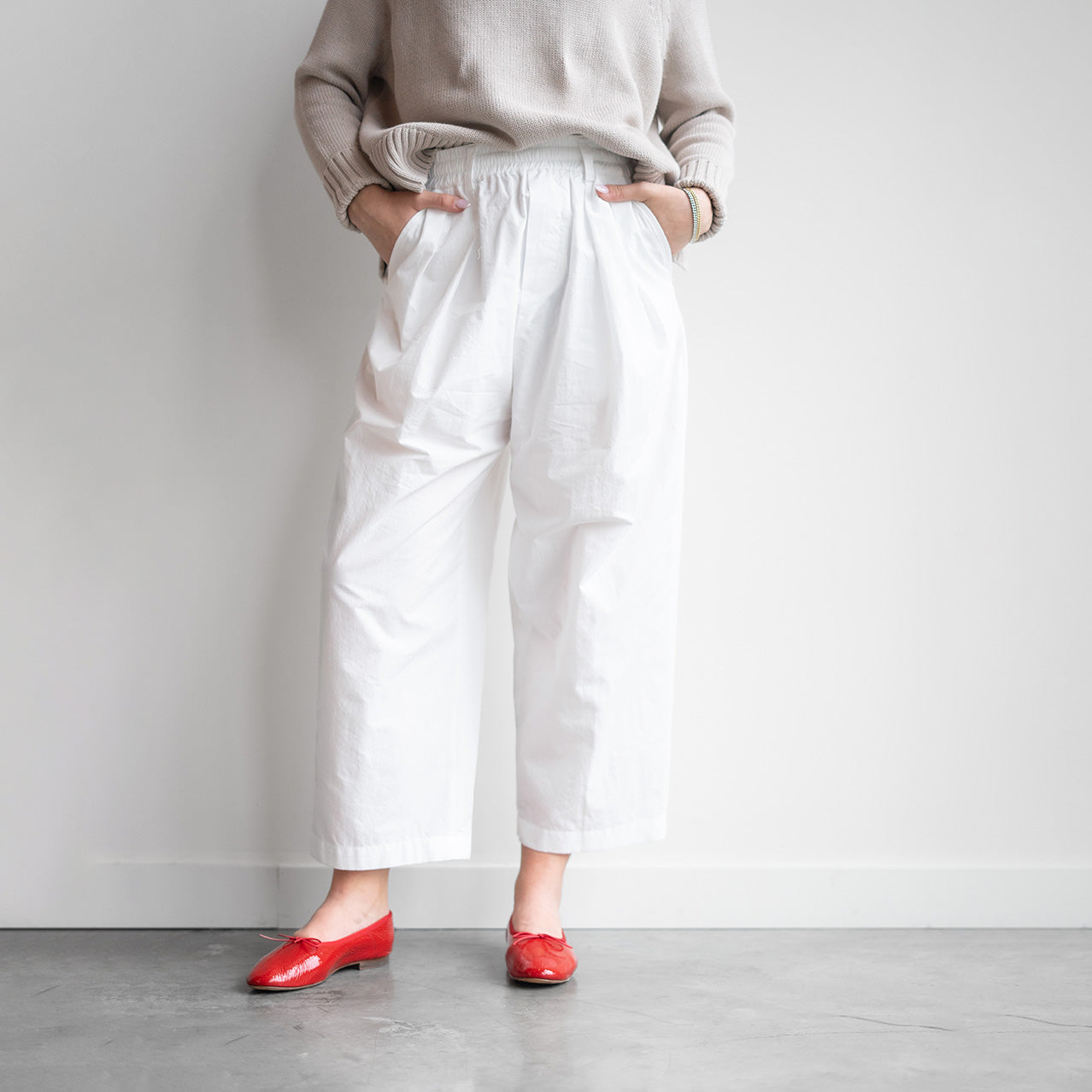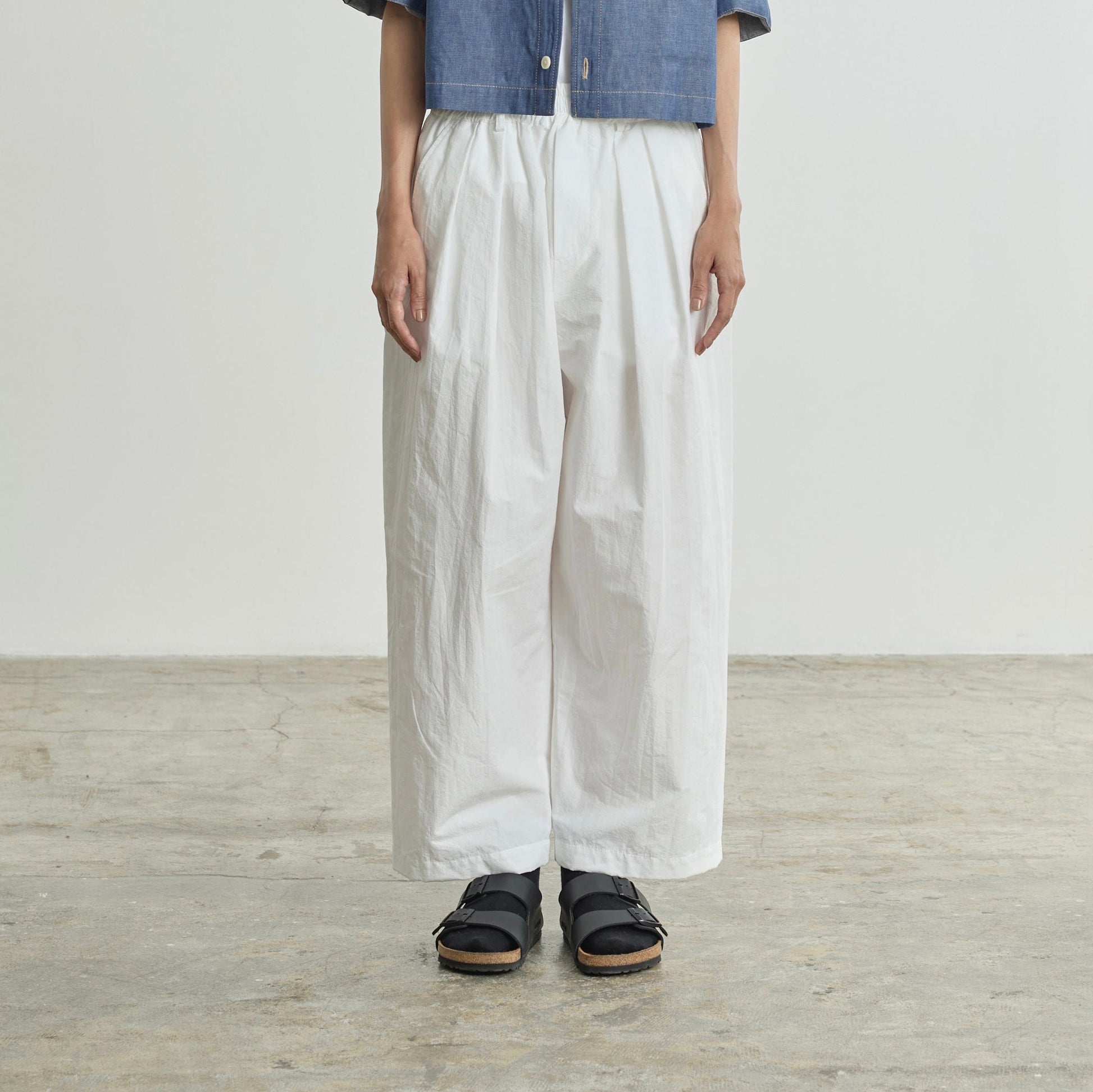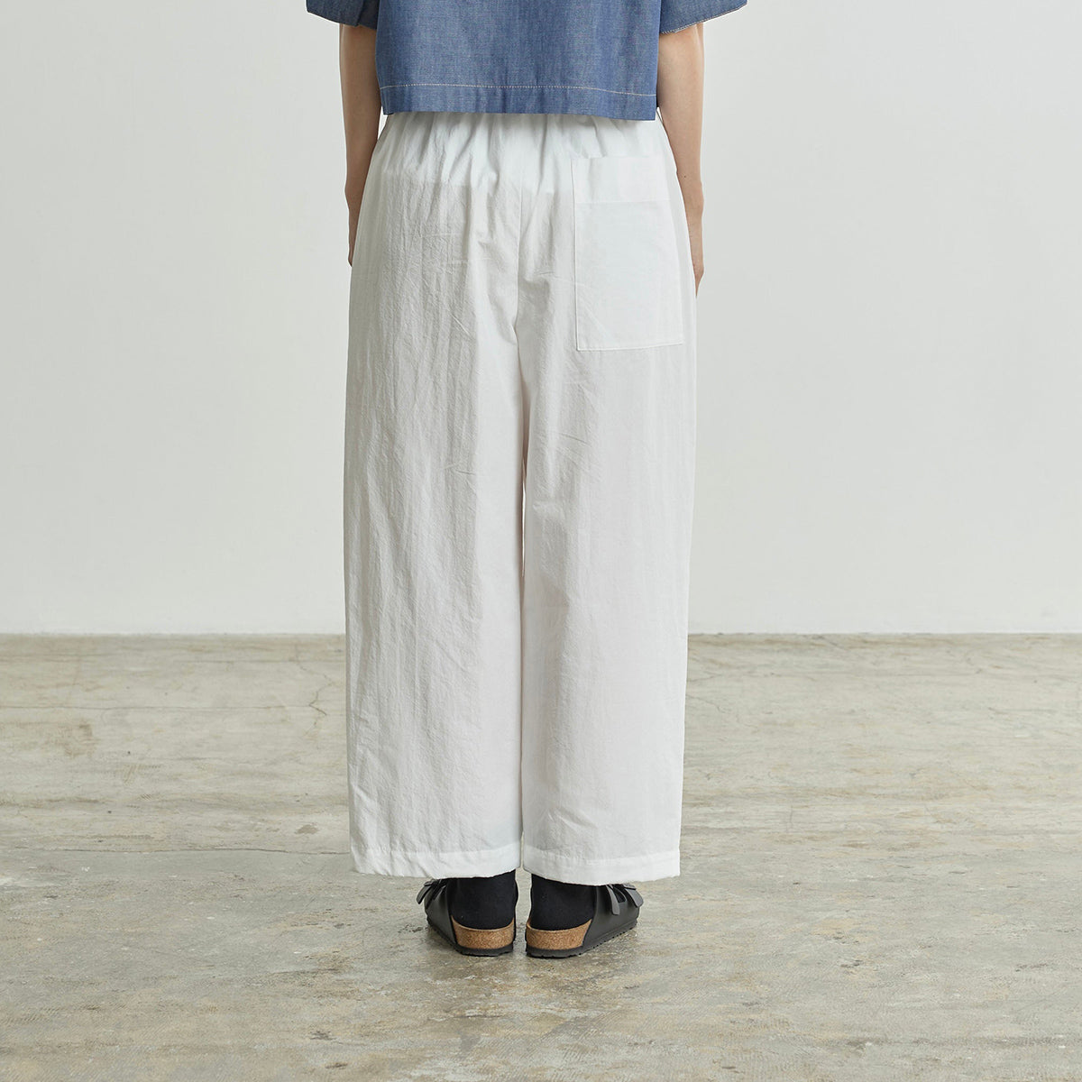 Elastic waistband with a drawstring. Wide, straight leg with pleat detailing. Single back pocket and belt loops